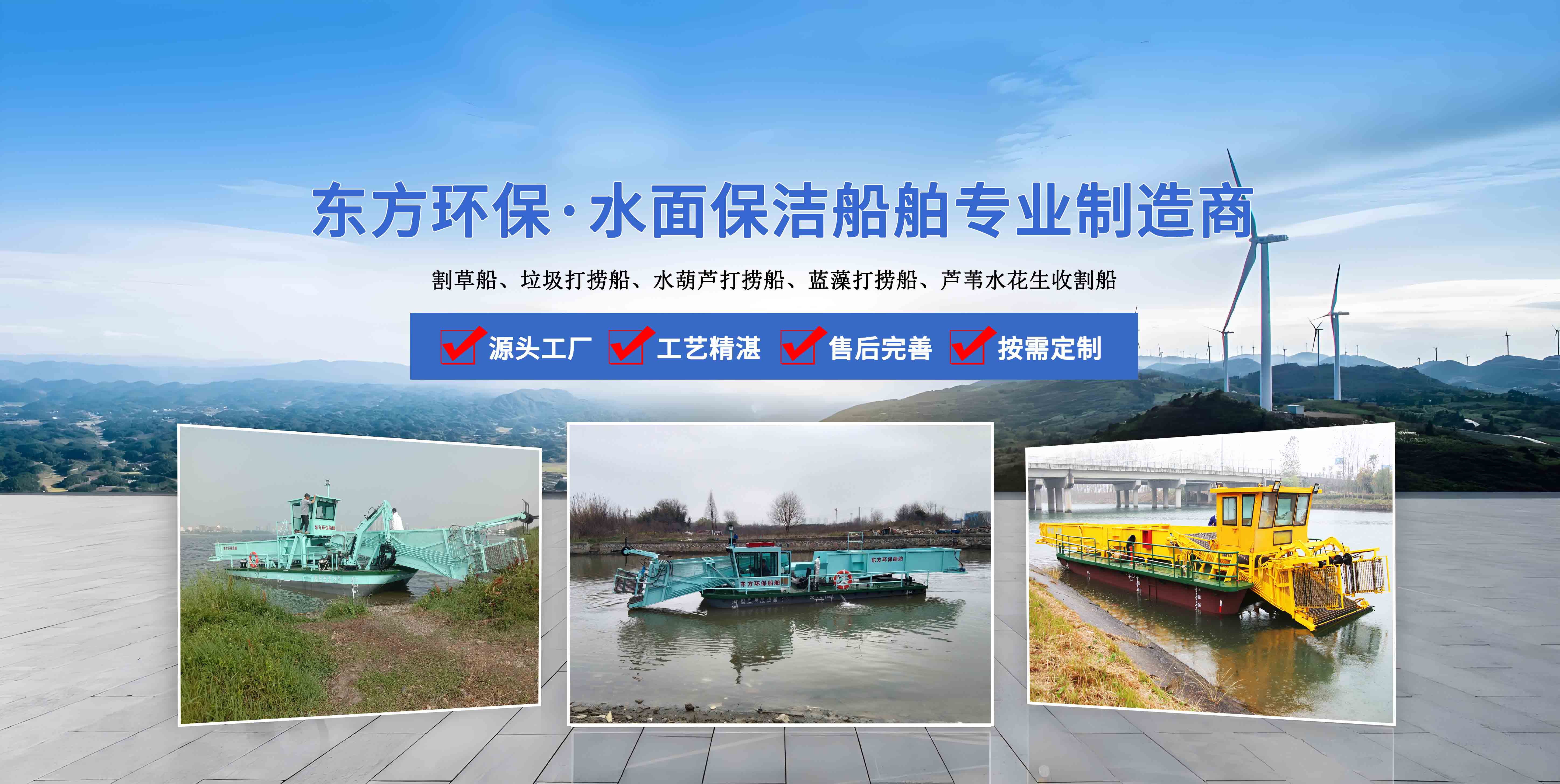 青州市東方環保機械制造有限公司位于山東省青州市,地理位置得天獨厚,是水面保潔船、水草收割船、、清漂船、滸苔打撈船、藍藻打撈船等水面船體的專業制造銷售廠家, 公司成立于2006年,公司先后與山東省黃河造船廠、中船重工702研究所、青島海洋大學、渤海船舶職業學院等機構建立了長期合作關系.。